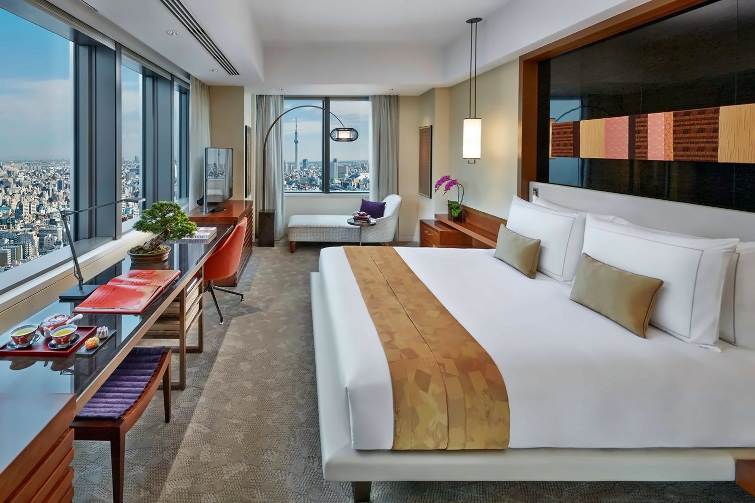 The 37th-floor spa is airy, the swimming pool looks out over the Imperial Palace, and the bedrooms have wall-to-ceiling glass.