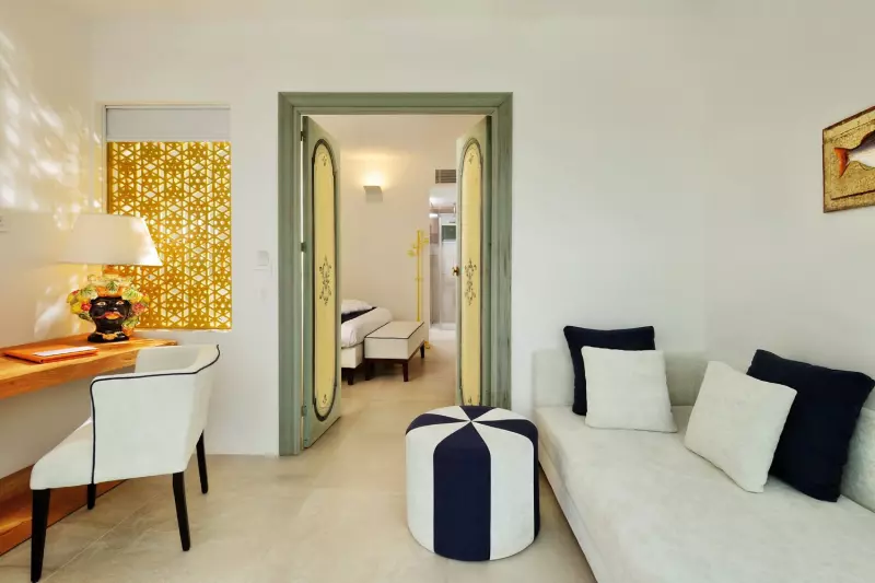 The Family Suite welcomes guests with two bright open areas on the first floor. Each space opens onto an expansive terrace that overlooks the sea