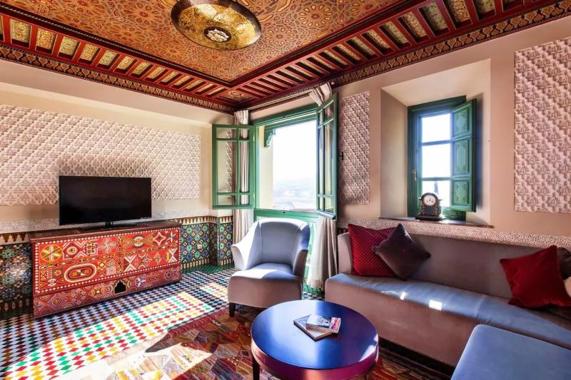 The Grand Vizir Suite is a stunning room at the top of the palace, offering breathtaking views of the ancient medina of Fez. From its